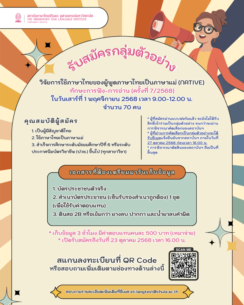สถาบันภาษาไทยสิรินธร เปิดรับสมัครกลุ่มตัวอย่างเพื่อเก็บข้อมูลวิจัยการใช้ภาษาไทยของผู้พูดภาษาไทยเป็นภาษาแม่ (Native) ทักษะการฟัง-การอ่าน (ครั้งที่ 7/2568)
