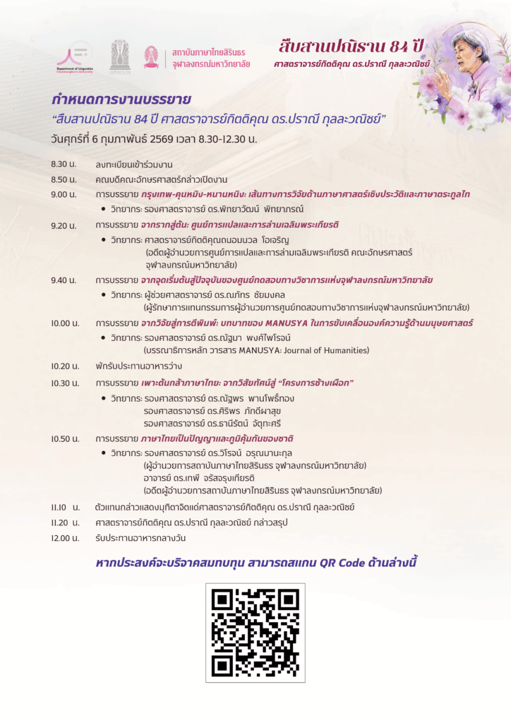 สถาบันภาษาไทยสิรินธร จุฬาลงกรณ์มหาวิทยาลัย ขอเชิญทุกท่านร่วมร่วมฟังการบรรยาย “สืบสานปณิธาน 84 ปี ศาสตราจารย์กิตติคุณ ดร.ปราณี กุลละวณิชย์”