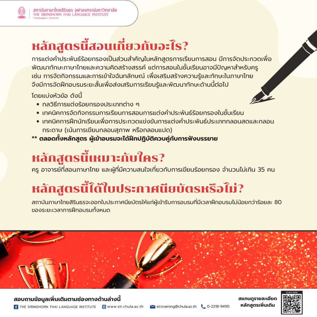 - หลักสูตรการเขียนร้อยกรองเพื่อการจัดการเรียนการสอนและประกวดแข่งขัน