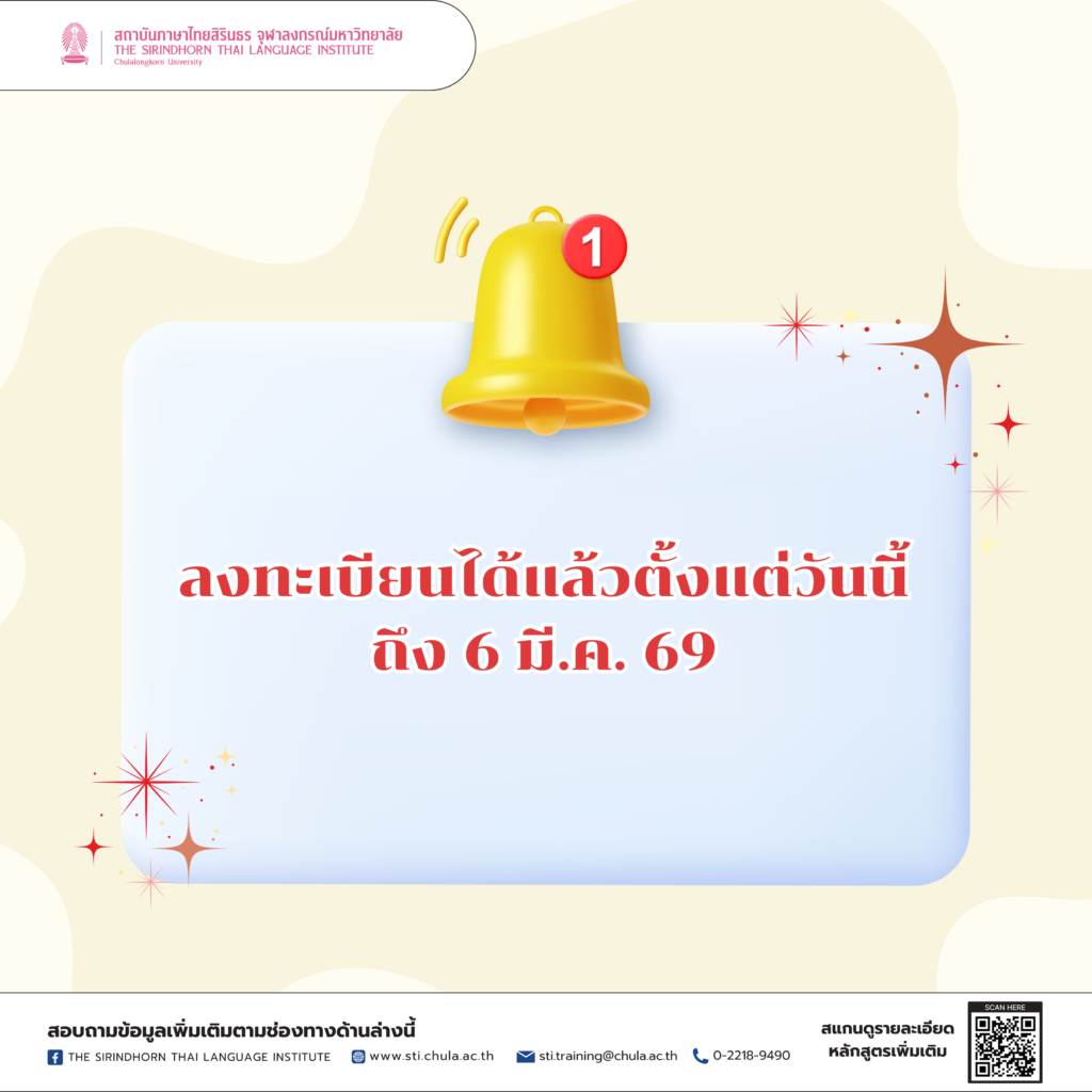 สถาบันภาษาไทยสิรินธรขอเชิญชวนผู้ที่สนใจลงทะเบียนสมัครอบรมเพื่อเพิ่มพูนความรู้และทักษะการใช้ภาษาไทย