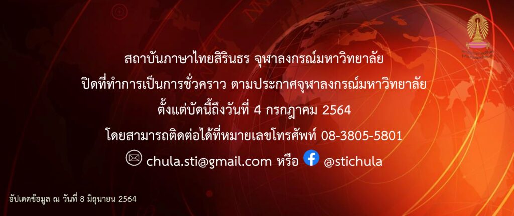 ตามประกาศจุฬาลงกรณ์มหาวิทยาลัย เรื่อง การขยายเวลาการปิดสถานที่ทำการชั่วคราว การจัดการเรียนการสอน และการปฏิบัติงาน ในช่วงการแพร่ระบาดของโรค COVID-19 (ฉบับที่ 2) ลงวันที่ 17 พฤษภาคม 2564 และประกาศจุฬาลงกรณ์มหาวิทยาลัย เรื่อง การขยายเวลาการปิดสถานที่ทำการชั่วคราว การจัดการเรียนการสอน และการปฏิบัติงาน ในช่วงการแพร่ระบาดของโรค COVID-19 (ฉบับที่ 3) ลงวันที่ 8 มิถุนายน 2564 นั้น