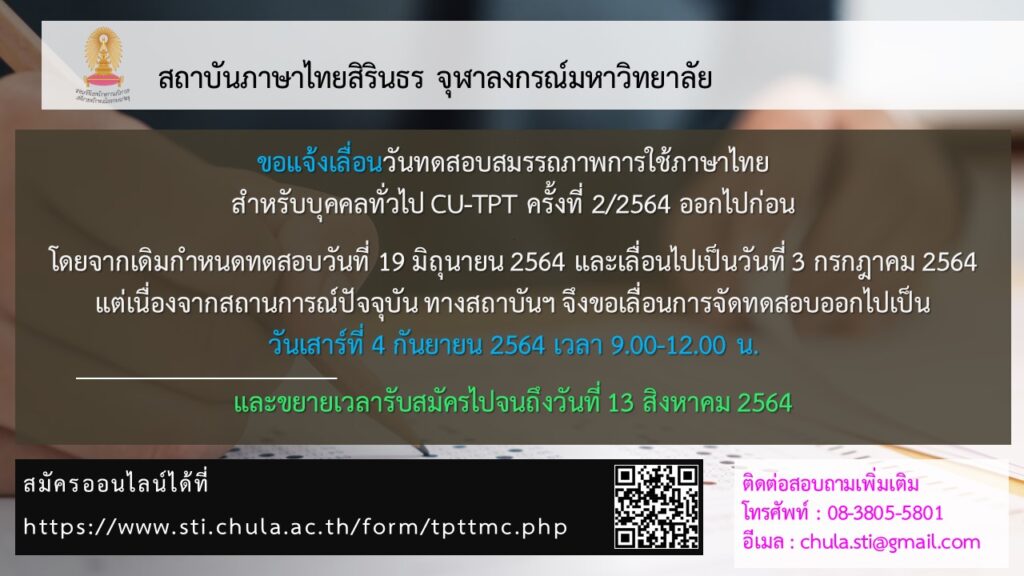เนื่องจากสถานการณ์ปัจจุบัน ทางสถาบันภาษาไทยสิรินธรพิจารณาแล้วเห็นควรเลื่อนการจัดทดสอบสมรรถภาพการใช้ภาษาไทย สำหรับบุคคลทั่วไป CU-TPT ครั้งที่ 2/2564 ออกไปก่อน โดยจากเดิมที่มีกำหนดจัดการทดสอบวันที่ 19 มิถุนายน 2564 และได้เลื่อนออกไปเป็นวันที่ 3 กรกฎาคม 2564 แล้วครั้งหนึ่งนั้น ทางสถาบันฯ ขอเลื่อนการทดสอบออกไปอีกครั้งเป็นวันที่ 4 กันยายน 2564 (ซึ่งจะตรงกับการจัดทดสอบครั้งที่ 3/2564 ที่เคยกำหนดไว้)