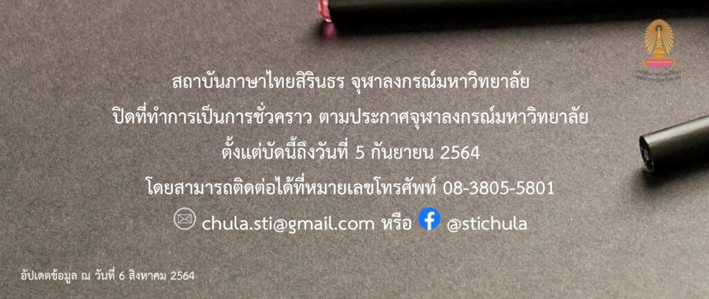 สถาบันฯ จึงขอปิดทำการชั่วคราวตั้งแต่บัดนี้จนถึงวันที่ 5 กันยายน 2564 โดยผู้มีความประสงค์จะติดต่อกับทางสถาบันฯ สามารถติดต่อได้ทางช่องทางต่อไปนี้