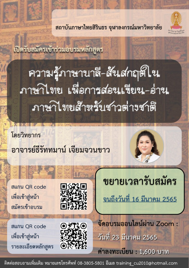 สถาบันภาษาไทยสิรินธร ขอเชิญชวนผู้สนใจสมัครเข้าร่วมอบรมหลักสูตร “ความรู้ภาษาบาลี-สันสกฤตในภาษาไทย เพื่อการสอนเขียน-อ่านภาษาไทยสำหรับชาวต่างชาติ”