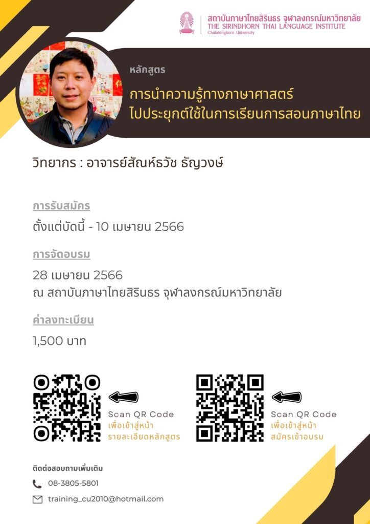สถาบันภาษาไทยสิรินธร ขอเชิญชวนผู้สนใจสมัครเข้าร่วมอบรมหลักสูตร “การนำความรู้ทางภาษาศาสตร์ไปประยุกต์ใช้ในการเรียนการสอนภาษาไทย”