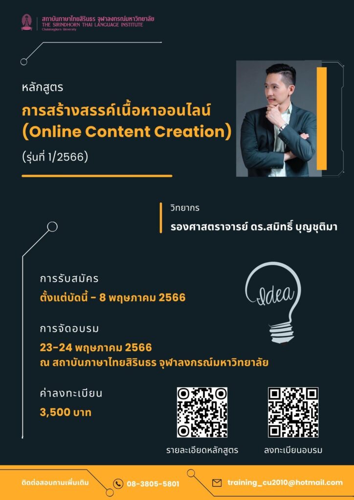 สถาบันภาษาไทยสิรินธร ขอเชิญชวนผู้สนใจสมัครเข้าร่วมอบรมหลักสูตร “การสร้างสรรค์เนื้อหาออนไลน์ (Online Content Creation) (รุ่นที่ 1/2566)”