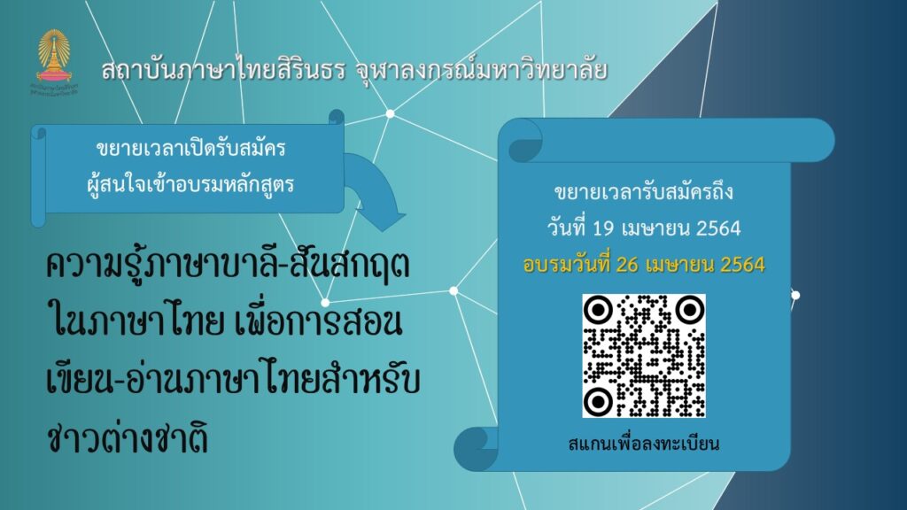 ขยายเวลารับสมัครผู้สนใจเข้าอบรมหลักสูตร “ความรู้ภาษาบาลี-สันสกฤตในภาษาไทย เพื่อการสอนเขียน-อ่านภาษาไทยสำหรับชาวต่างชาติ”