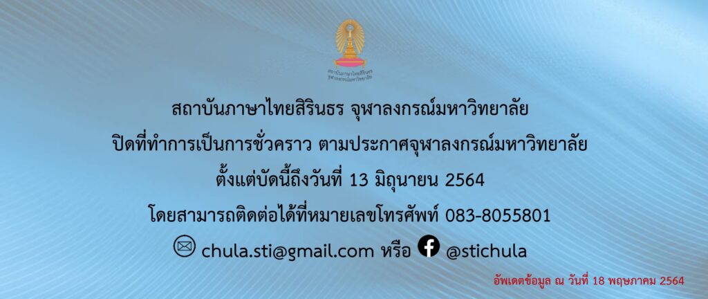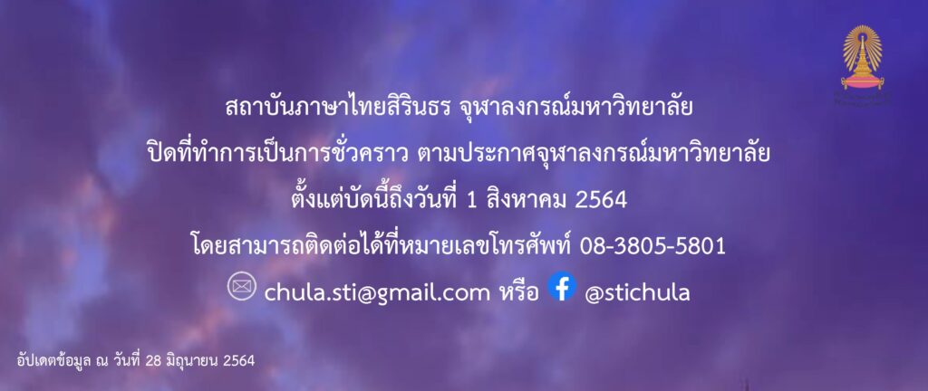 ประกาศ เรื่อง ปิดที่ทำการเป็นการชั่วคราวของสถาบันภาษาไทยสิรินธร อันเนื่องมาจากภาวะการแพร่ระบาดของโรค COVID-19 ออกไปจนถึงวันที่ 1 สิงหาคม 2564