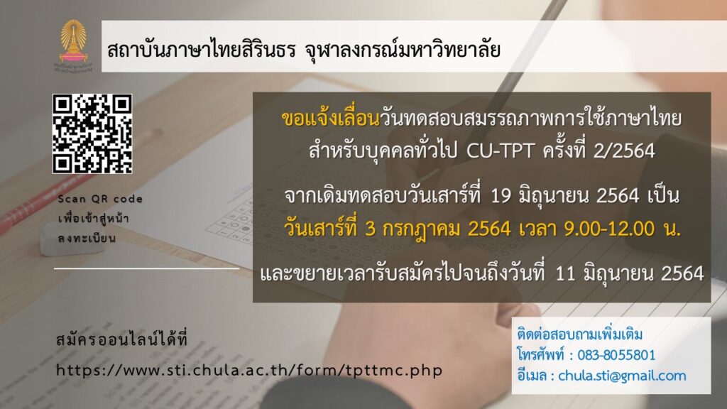แจ้งเลื่อนการจัดทดสอบสมรรถภาพการใช้ภาษาไทย สำหรับบุคคลทั่วไป CU-TPT ครั้งที่ 2/2564