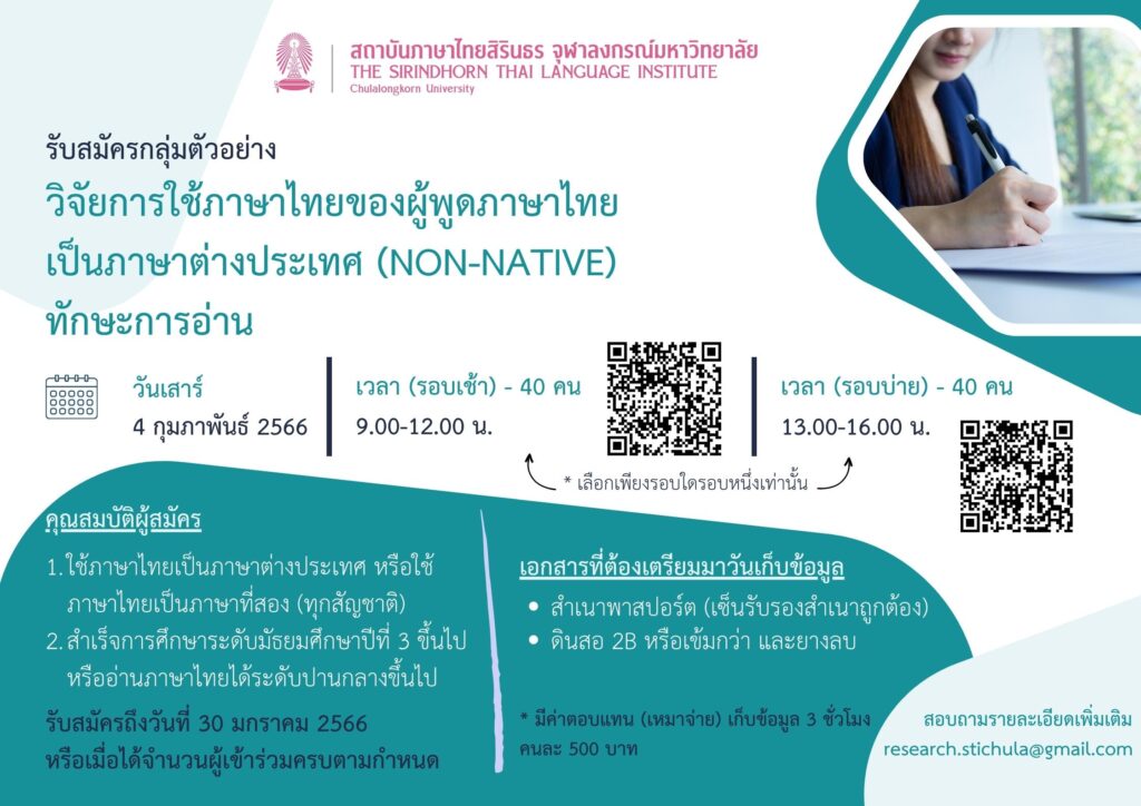 สถาบันภาษาไทยสิรินธร เปิดรับสมัครกลุ่มตัวอย่างเพื่อการทำวิจัยการใช้ภาษาไทย (สำหรับผู้พูดภาษาไทยเป็นภาษาต่างประเทศ) ครั้งที่ 1/2566