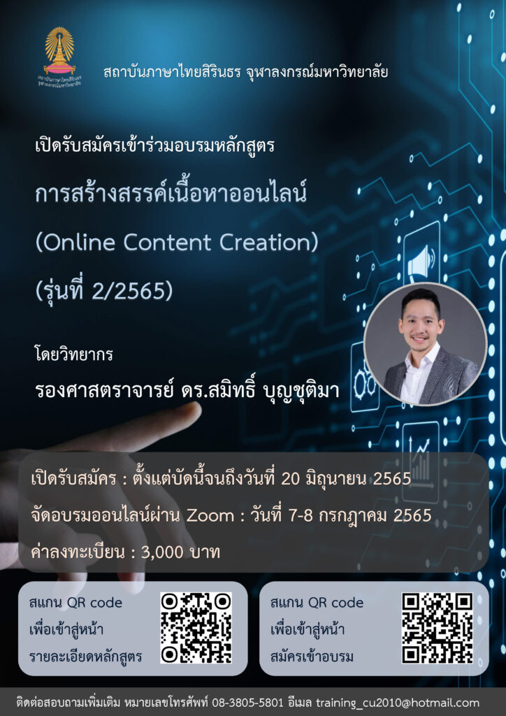 สถาบันภาษาไทยสิรินธร ขอเชิญชวนผู้สนใจสมัครเข้าร่วมอบรมหลักสูตร “การสร้างสรรค์เนื้อหาออนไลน์ (Online Content Creation) (รุ่นที่ 2/2565)”