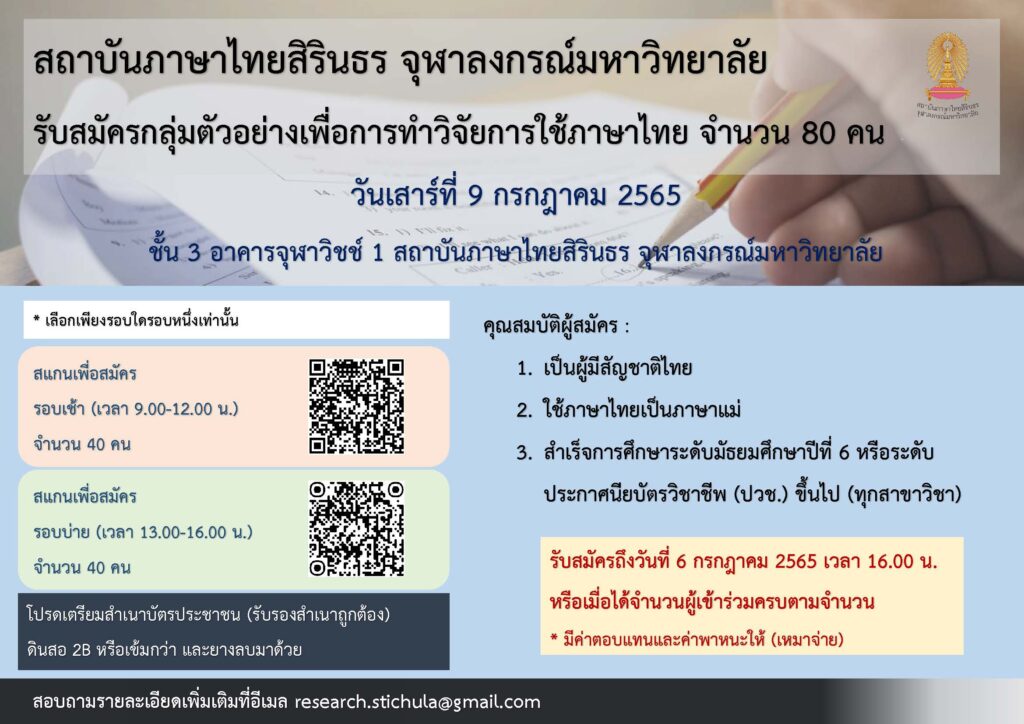 สถาบันภาษาไทยสิรินธร เปิดรับสมัครกลุ่มตัวอย่างเพื่อการทำวิจัยการใช้ภาษาไทย
