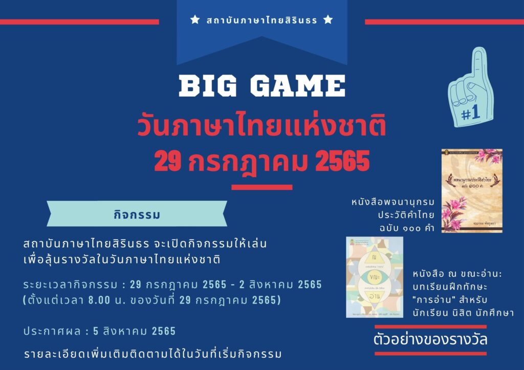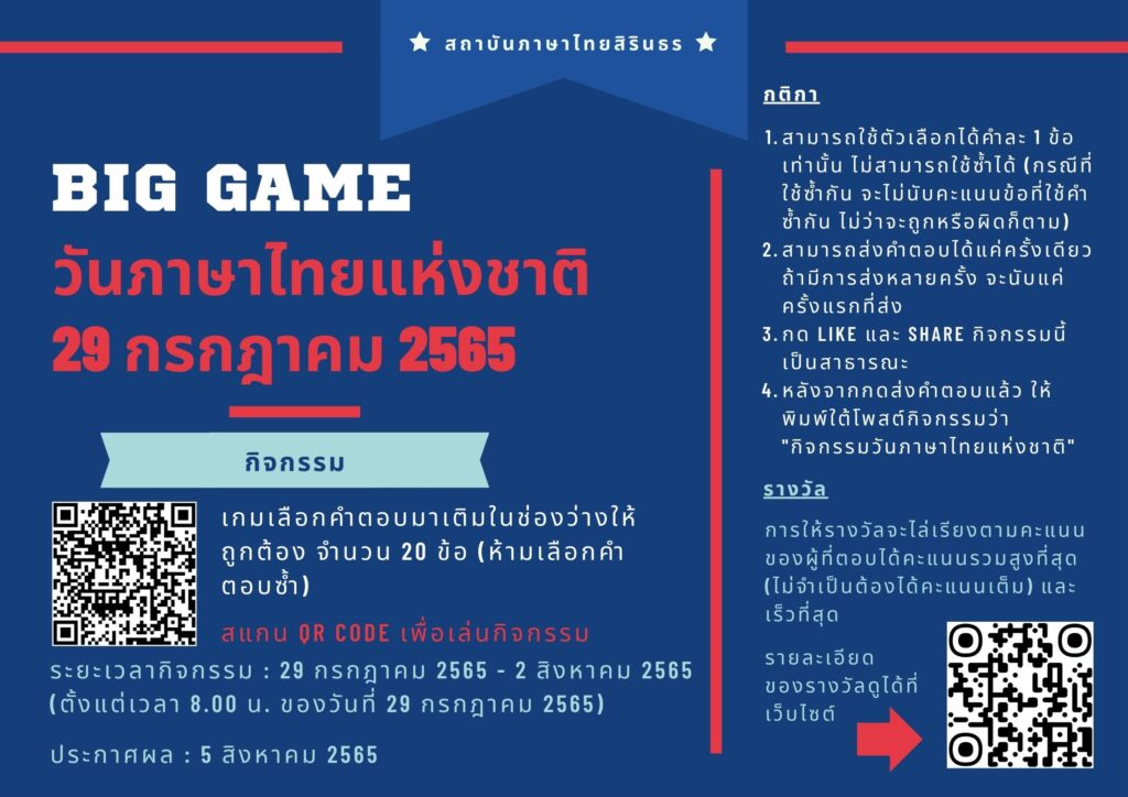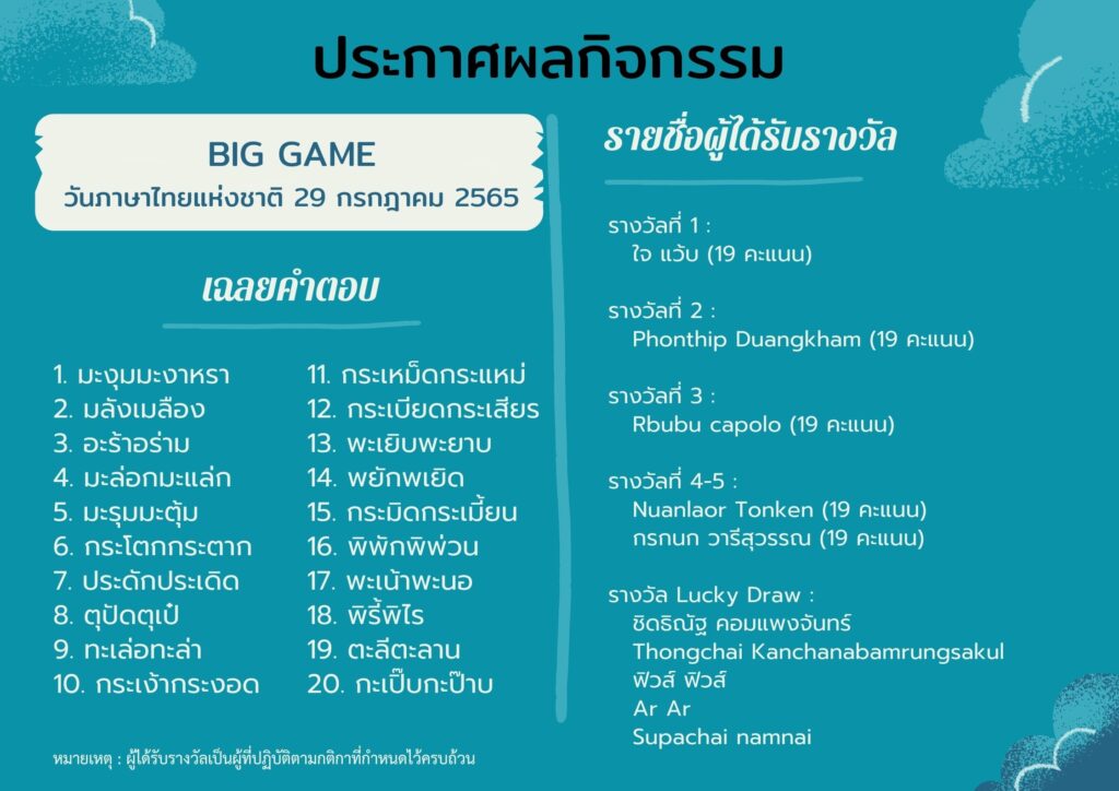 ประกาศผลกิจกรรม “BIG GAME วันภาษาไทยแห่งชาติ 29 กรกฎาคม 2565”