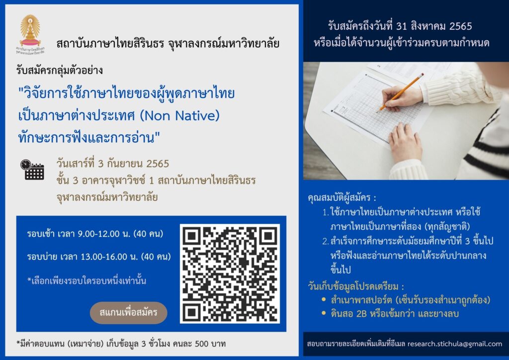 สถาบันภาษาไทยสิรินธร เปิดรับสมัครกลุ่มตัวอย่างเพื่อการทำวิจัยการใช้ภาษาไทย (สำหรับผู้พูดภาษาไทยเป็นภาษาต่างประเทศ)