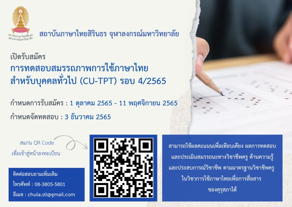 เปิดรับสมัครการทดสอบสมรรถภาพการใช้ภาษาไทยสำหรับบุคคลทั่วไป (CU-TPT) รอบ 4/2565